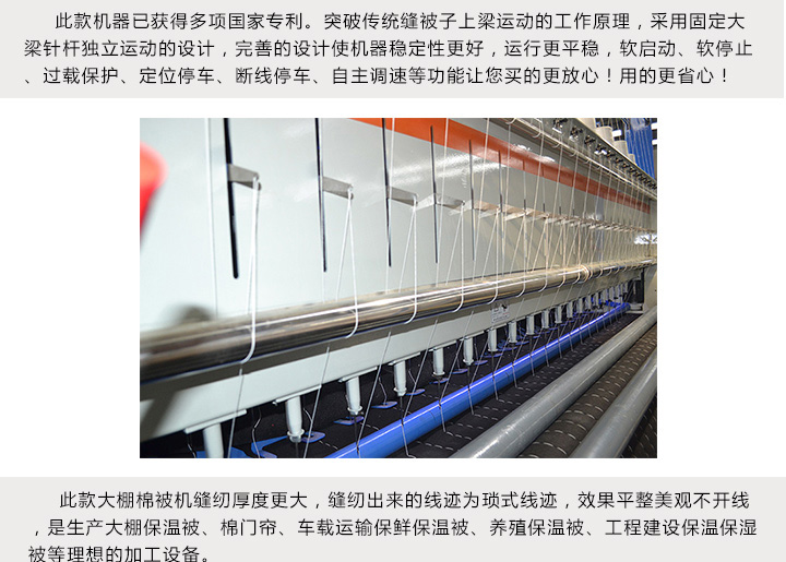 產品簡介:2米寬幅保溫被棉被機多針大棚被保溫被縫被機用途和特點:本設備是生產家庭用棉被、絲棉被、棉門簾、大棚保溫被、車載保溫被等最新型設備。2米寬幅保溫被棉被機已突破傳統(tǒng)單線鏈式結構,改用雙線平縫結構。
